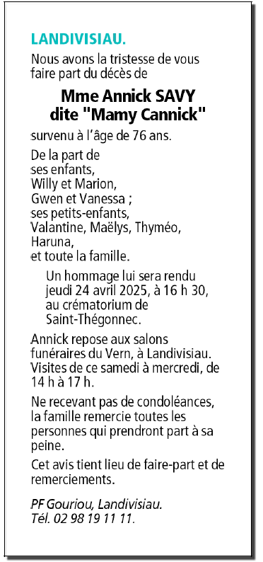 Décédée à La Forest-Landerneau (29800) le jeudi 17 avril 2025 à l'âge de 76 ans