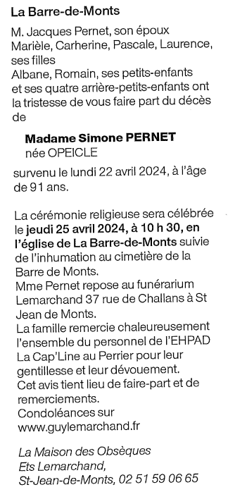 Madame Simone PERNET née OPEICLE
