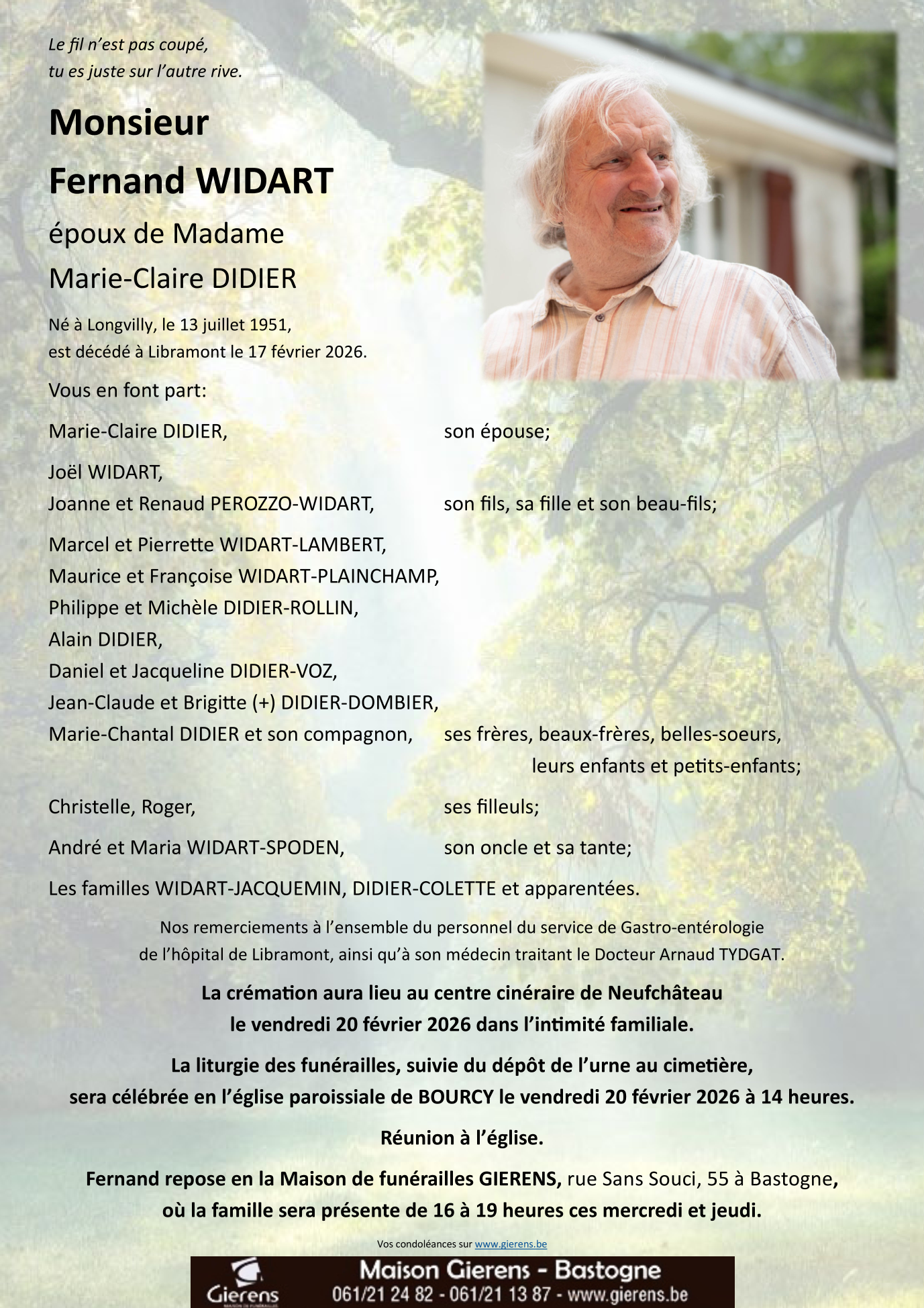 Died in Libramont-Chevigny (6800, Belgium) on 17 February 2026 at the age of 74 years