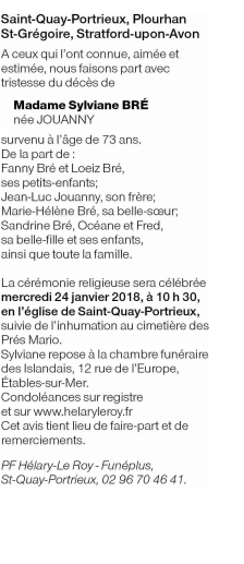 Overleden te Saint-Quay-Portrieux (22410) op zaterdag 20 januari 2018 op 73-jarige leeftijd