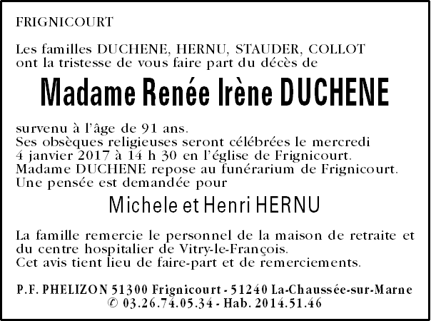 Overleden te Vitry-le-François (51300) op zaterdag 31 december 2016 op 91-jarige leeftijd