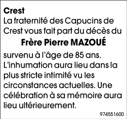 Décédé à Crest (26400) le dimanche 29 mars 2020 à l'âge de 85 ans
