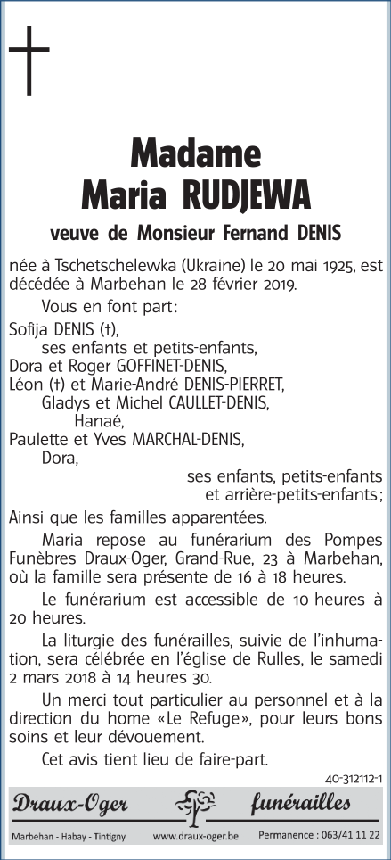 Décédée à Marbehan (6724, Belgique) le jeudi 28 février 2019 à l'âge de 93 ans