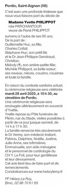 Décédée à Saint-Brieuc (22000) le mardi 21 avril 2020 à l'âge de 94 ans