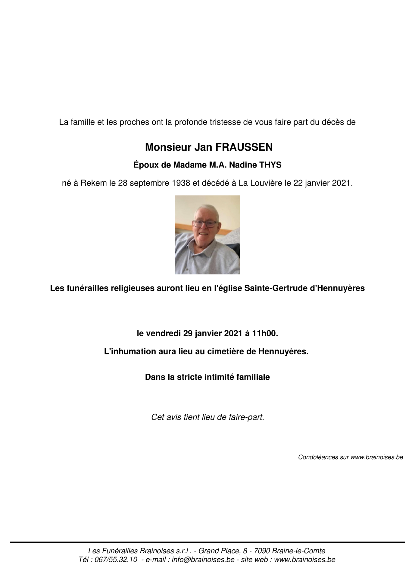 Décédé à La Louvière (7100, Belgique) le vendredi 22 janvier 2021 à l'âge de 82 ans