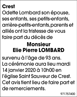 Décédé à Crest (26400) le vendredi 10 janvier 2020 à l'âge de 93 ans
