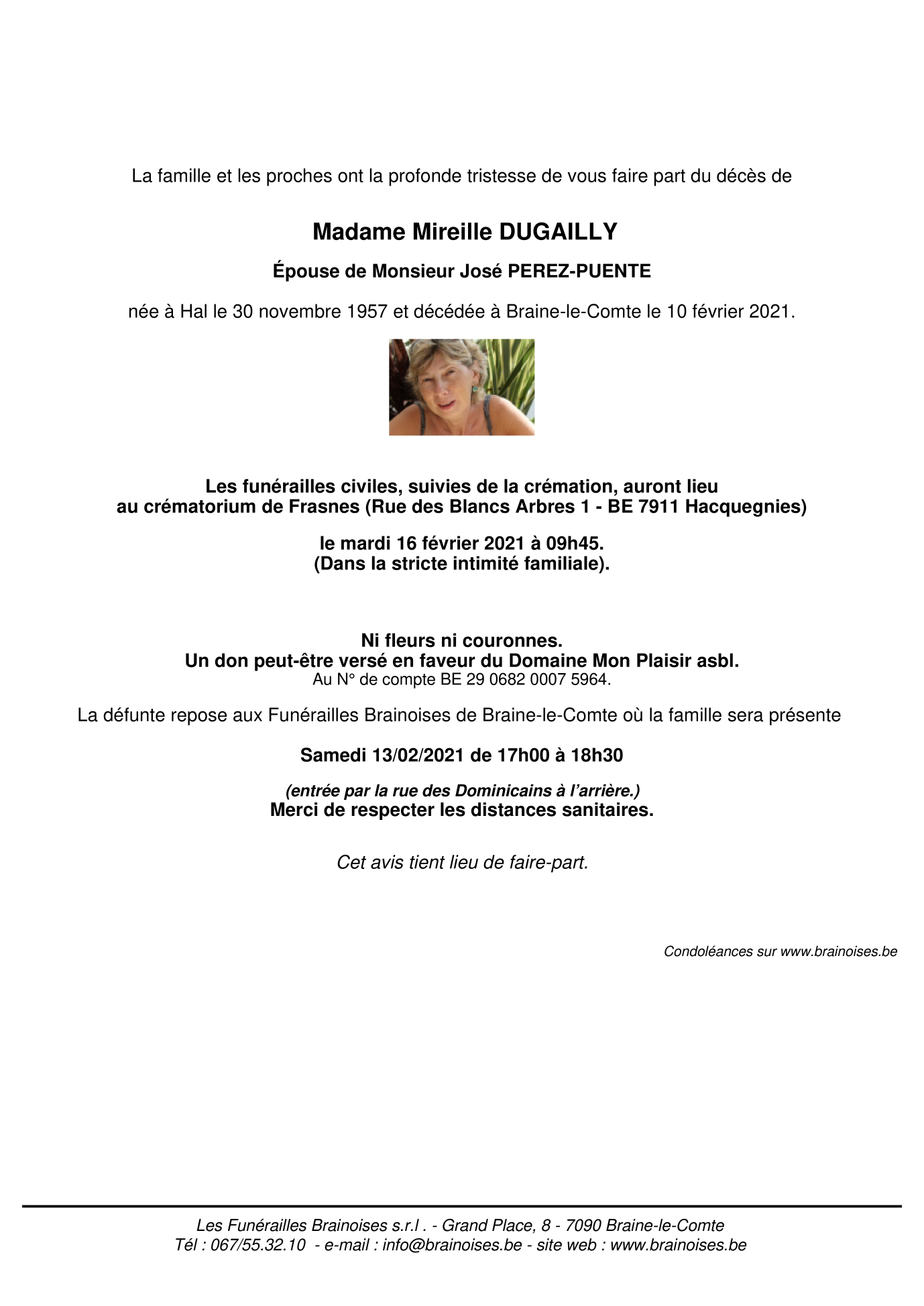 Décédée à Braine-le-Comte (7090, Belgique) le mercredi 10 février 2021 à l'âge de 63 ans
