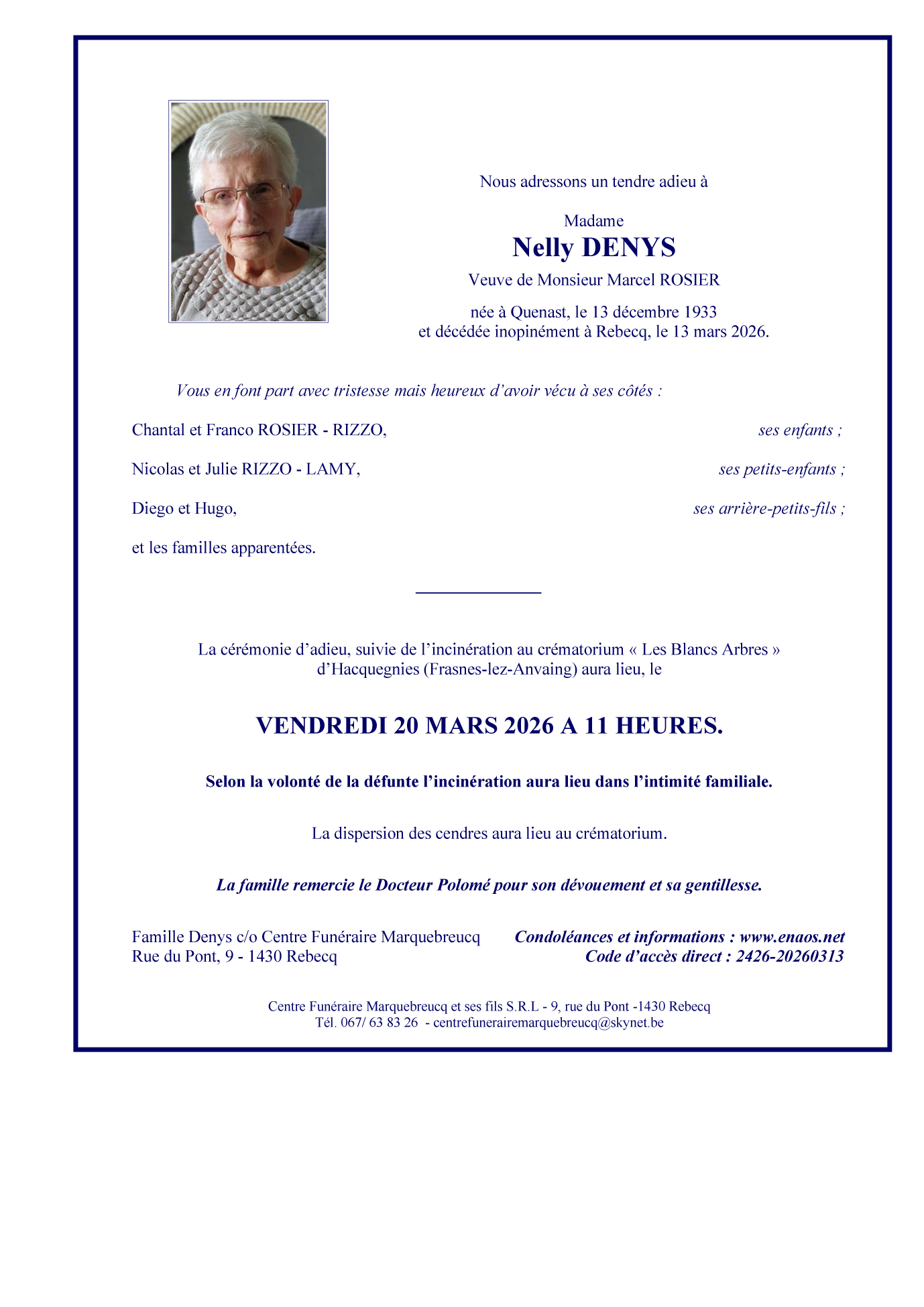 Overleden te Rebecq (1430, België) op vrijdag 13 maart 2026 op 92-jarige leeftijd
