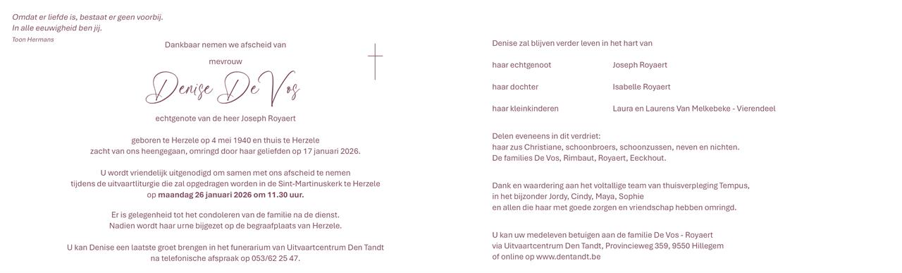 Fallecida en Herzele (9550, Bélgica) el sábado, 17 de enero de 2026 a la edad de 85 años