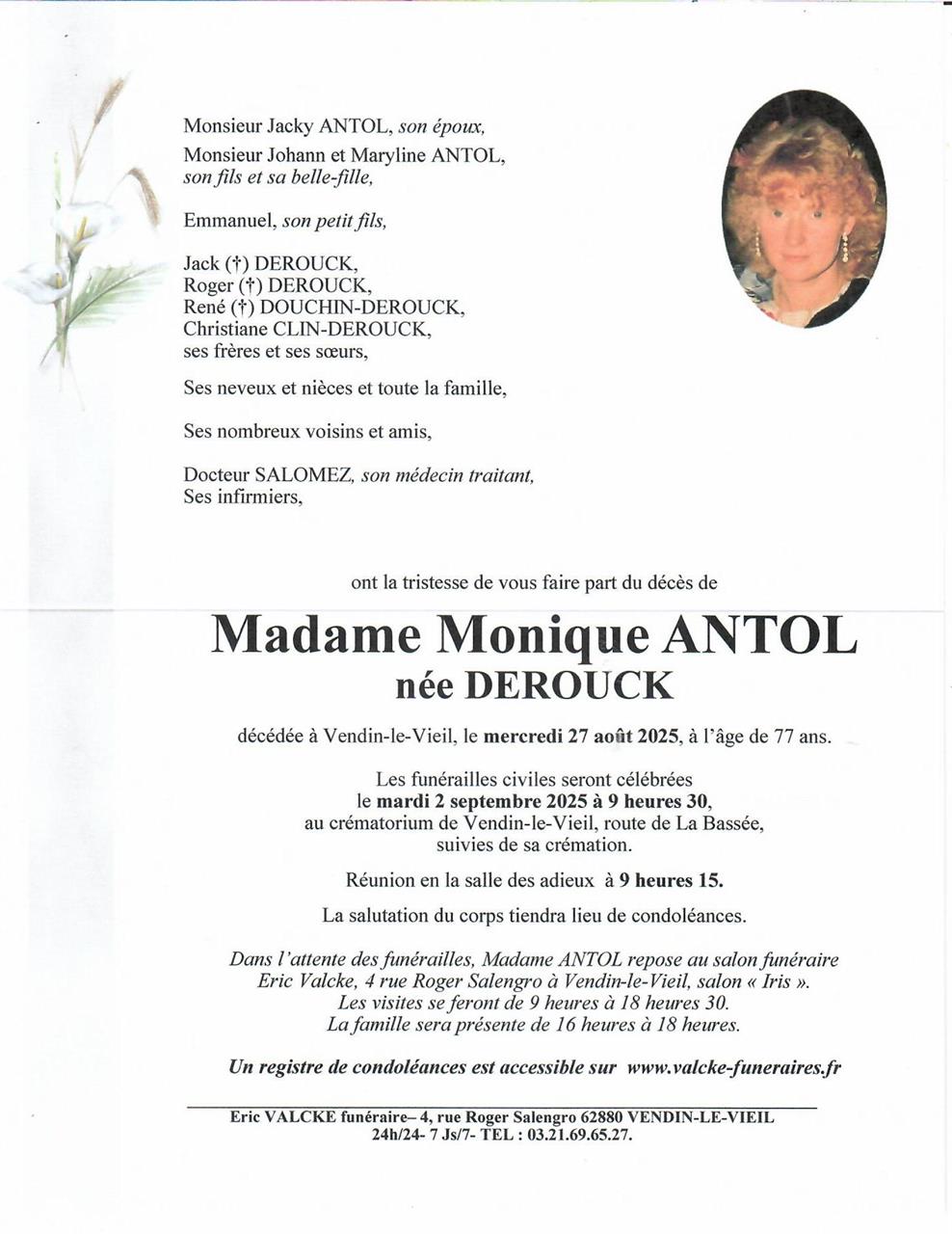 Madame Monique antol née DEROUCK