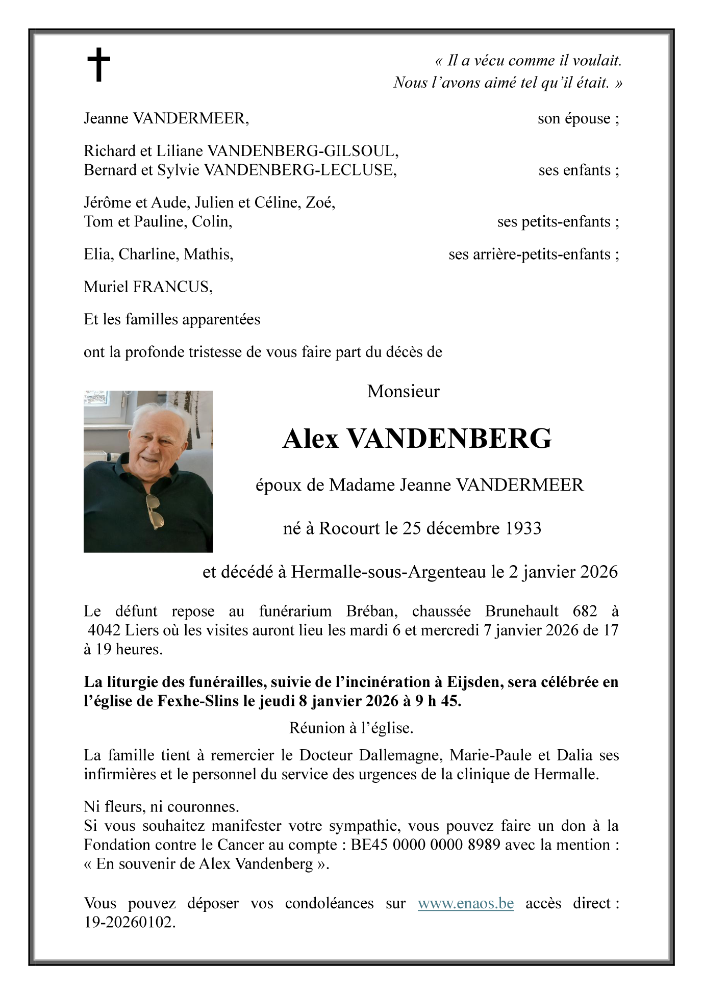 Died in Hermalle-sous-Argenteau (4681, Belgium) on 02 January 2026 at the age of 92 years