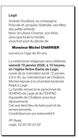 Décédé à Challans (85300) le mercredi 7 janvier 2026 à l'âge de 83 ans