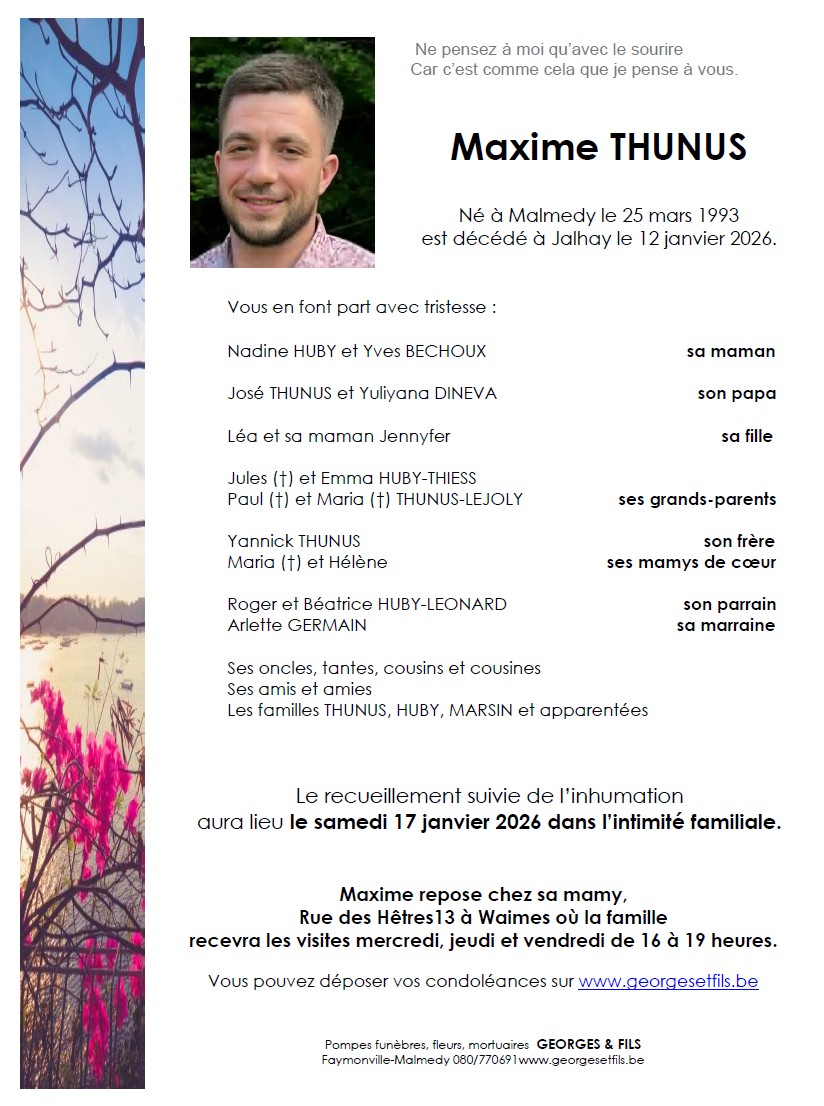 Décédé à Jalhay (4845, Belgique) le lundi 12 janvier 2026 à l'âge de 32 ans