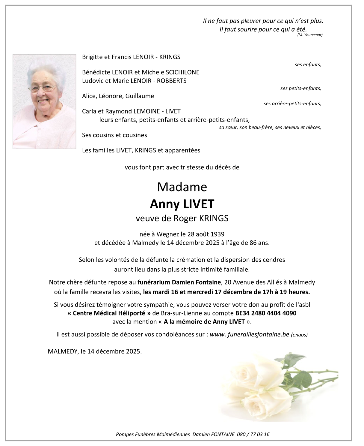 Fallecida en Malmedy (4960, Bélgica) el domingo, 14 de diciembre de 2025 a la edad de 86 años