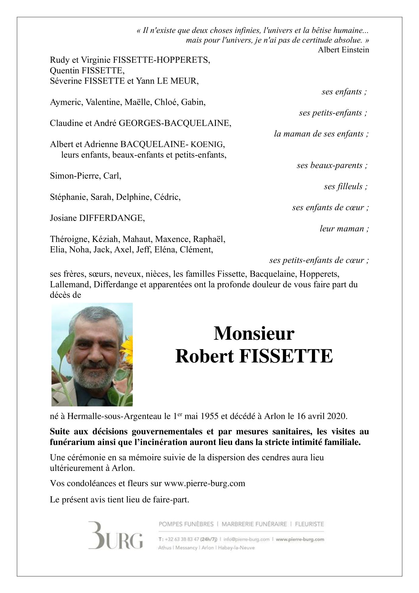 Décédé à Arlon (6700, Belgique) le jeudi 16 avril 2020 à l'âge de 64 ans