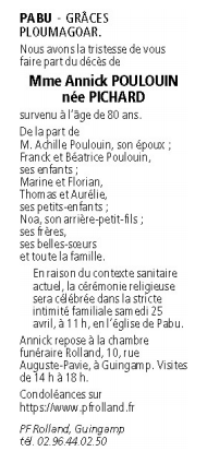 Décédée à Pabu (22200) le mercredi 22 avril 2020 à l'âge de 80 ans
