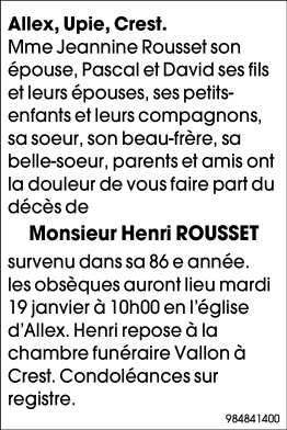 Décédé à Allex (26400) le jeudi 14 janvier 2021 à l'âge de 85 ans