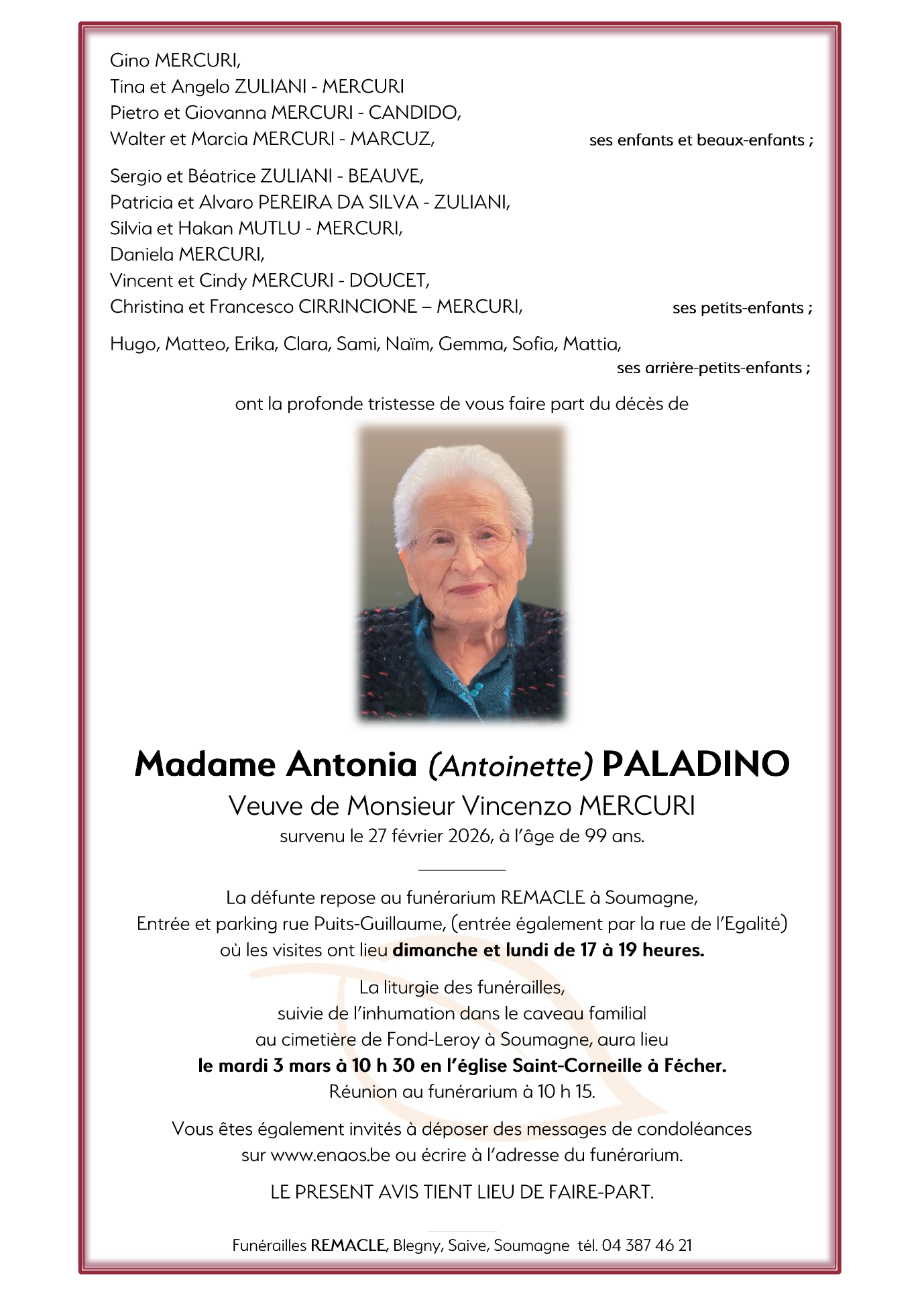 Décédée à Chênée (4032, Belgique) le vendredi 27 février 2026 à l'âge de 99 ans