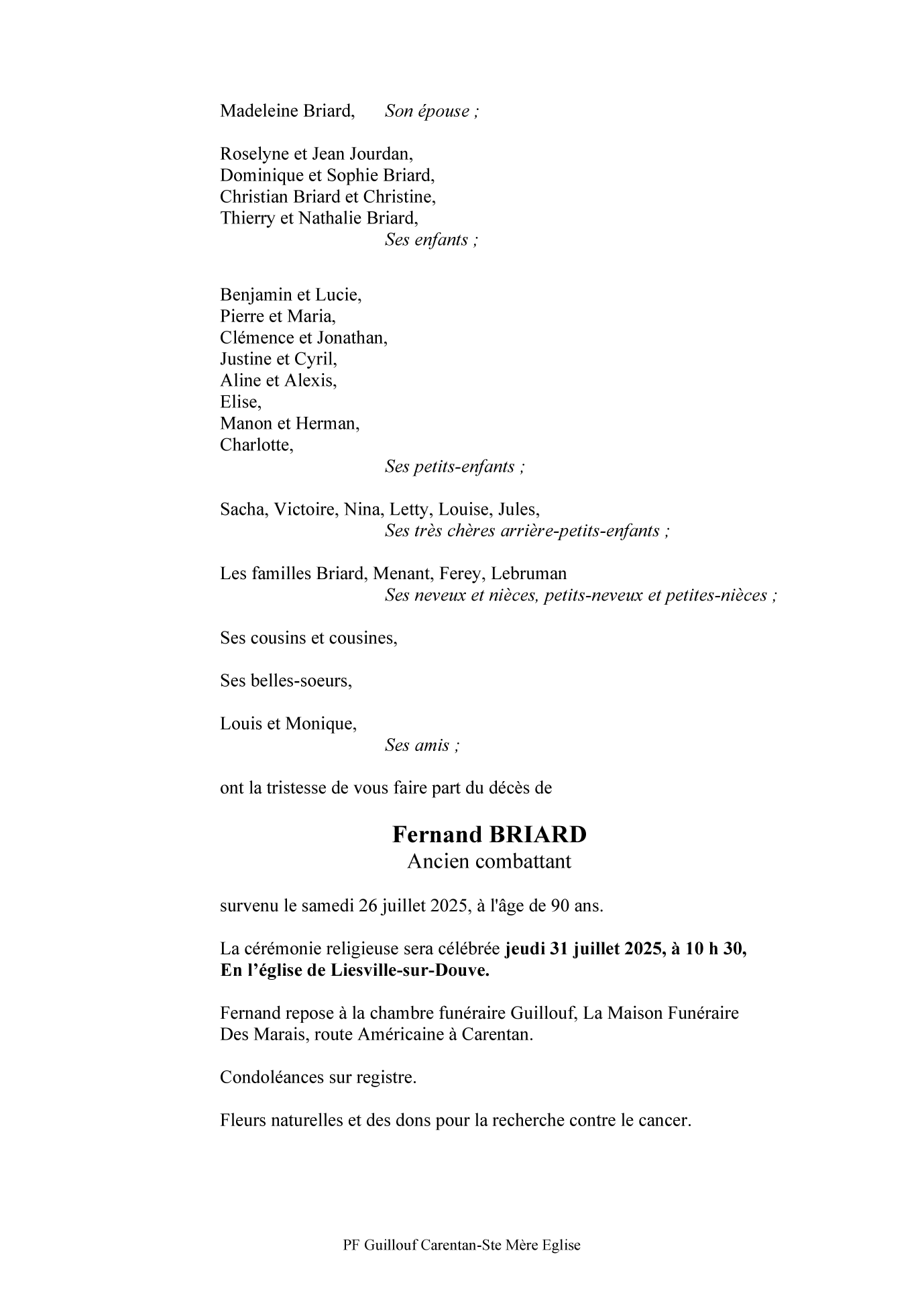 Died in Carentan (50500) on 26 July 2025 at the age of 90 years