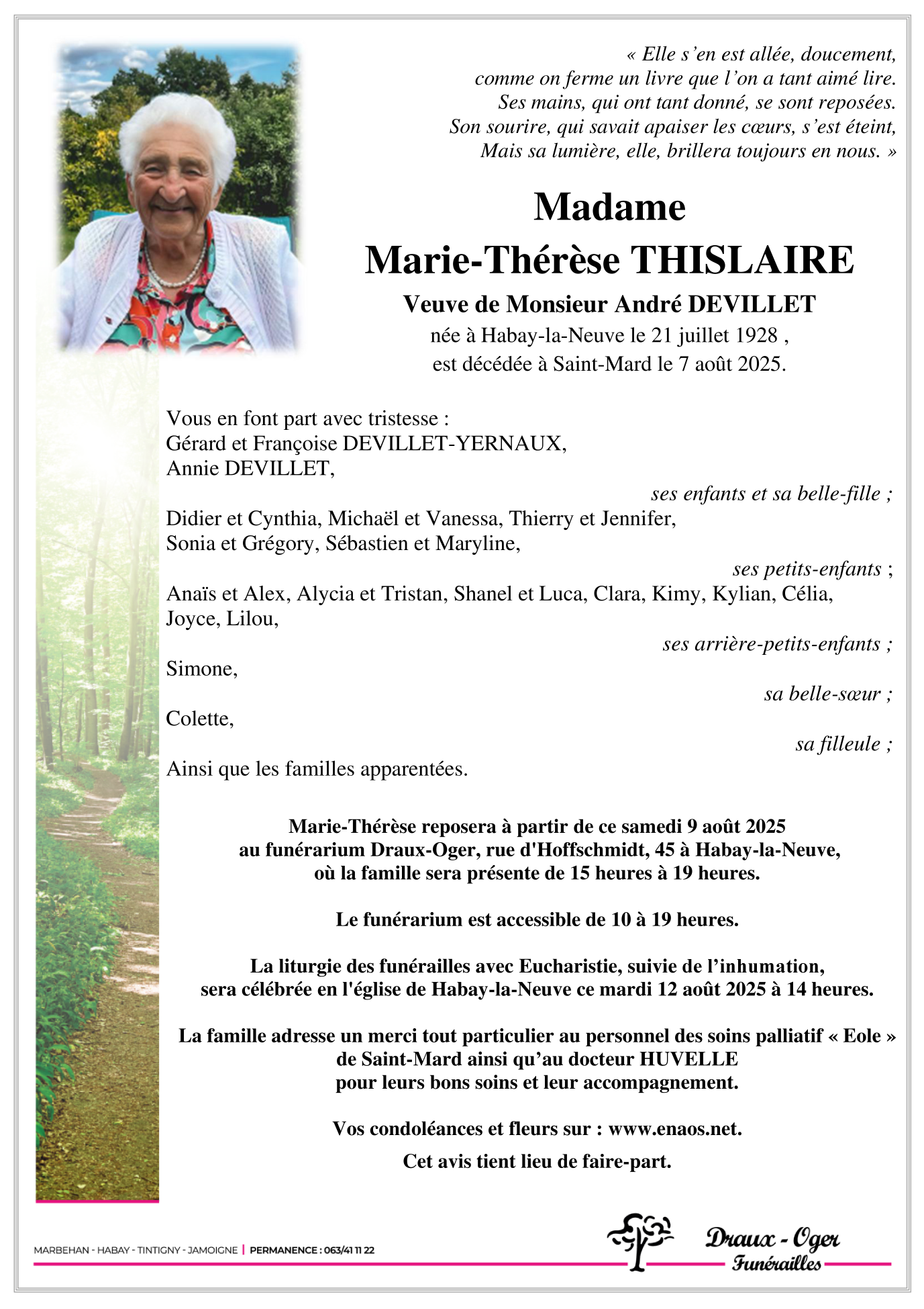 Décédée à Saint-Mard (6762, Belgique) le jeudi 7 août 2025 à l'âge de 97 ans
