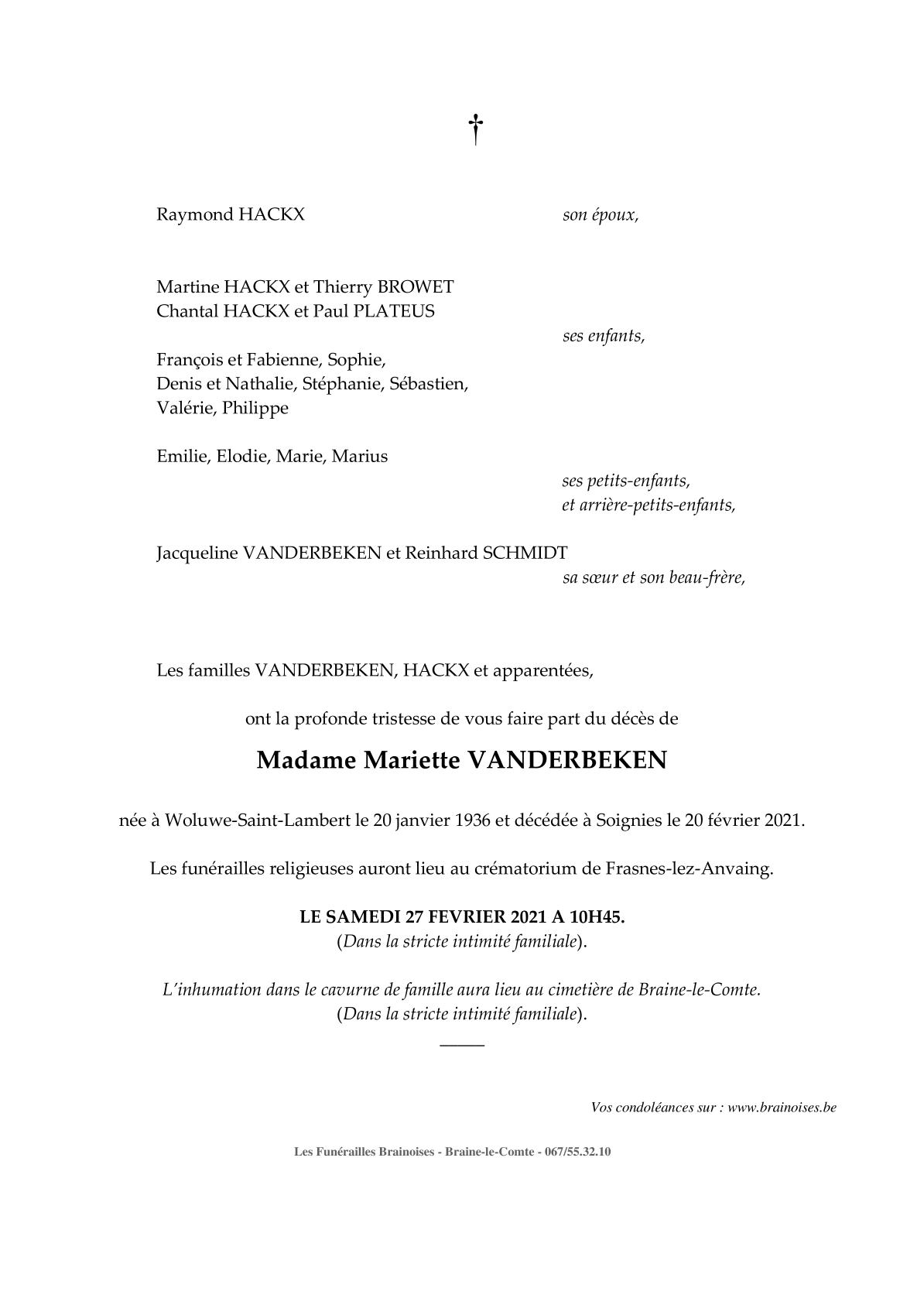 Fallecida en Soignies (7060, Bélgica) el sábado, 20 de febrero de 2021 a la edad de 85 años