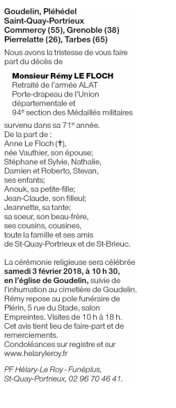 Décédé à Saint-Quay-Portrieux (22410) le mardi 30 janvier 2018 à l'âge de 70 ans