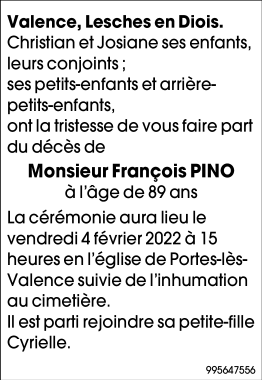 Décédé à Beauvallon (26800) le mardi 1 février 2022 à l'âge de 89 ans