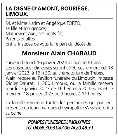 Décédé à Carcassonne (11000) le lundi 16 janvier 2023 à l'âge de 61 ans
