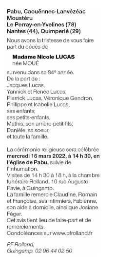 Décédée à Pabu (22200) le dimanche 13 mars 2022 à l'âge de 83 ans