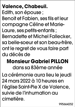 Décédé à Valence (26000) le lundi 21 mars 2022 à l'âge de 82 ans