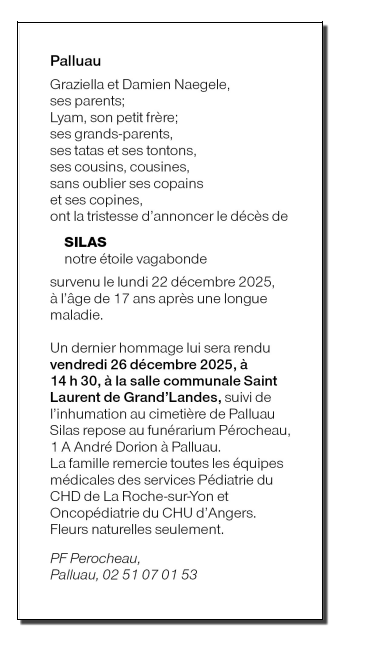 Décédé à La Roche-sur-Yon (85000) le lundi 22 décembre 2025 à l'âge de 17 ans