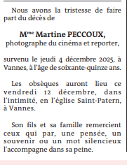 Décédée à Vannes (56000) le vendredi 5 décembre 2025 à l'âge de 75 ans