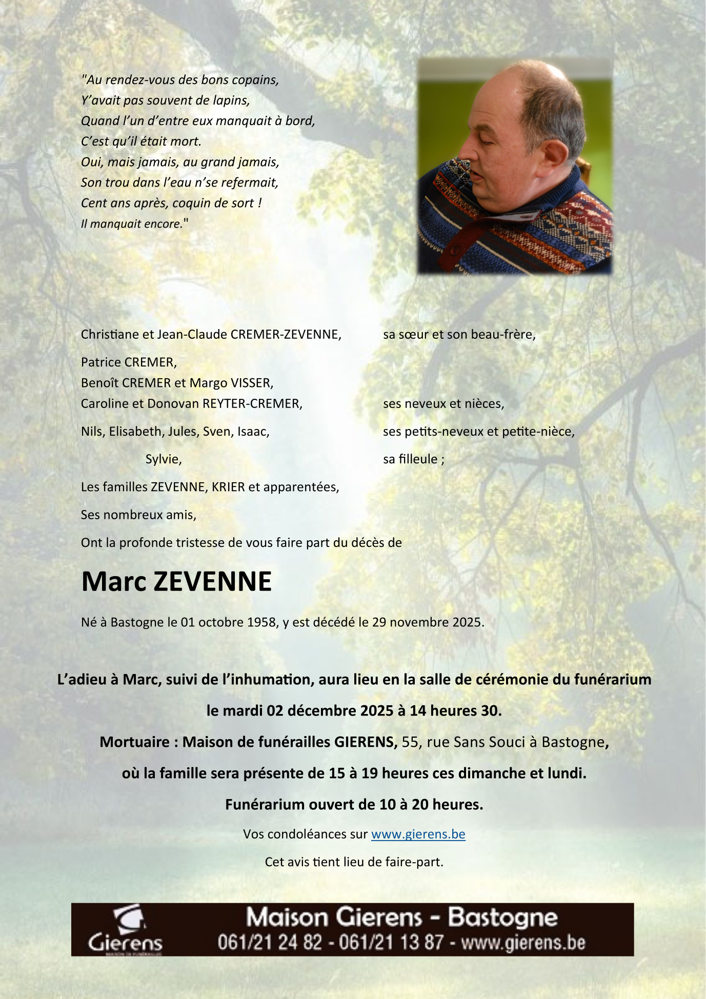 Décédé à Bastogne (6600, Belgique) le samedi 29 novembre 2025 à l'âge de 67 ans