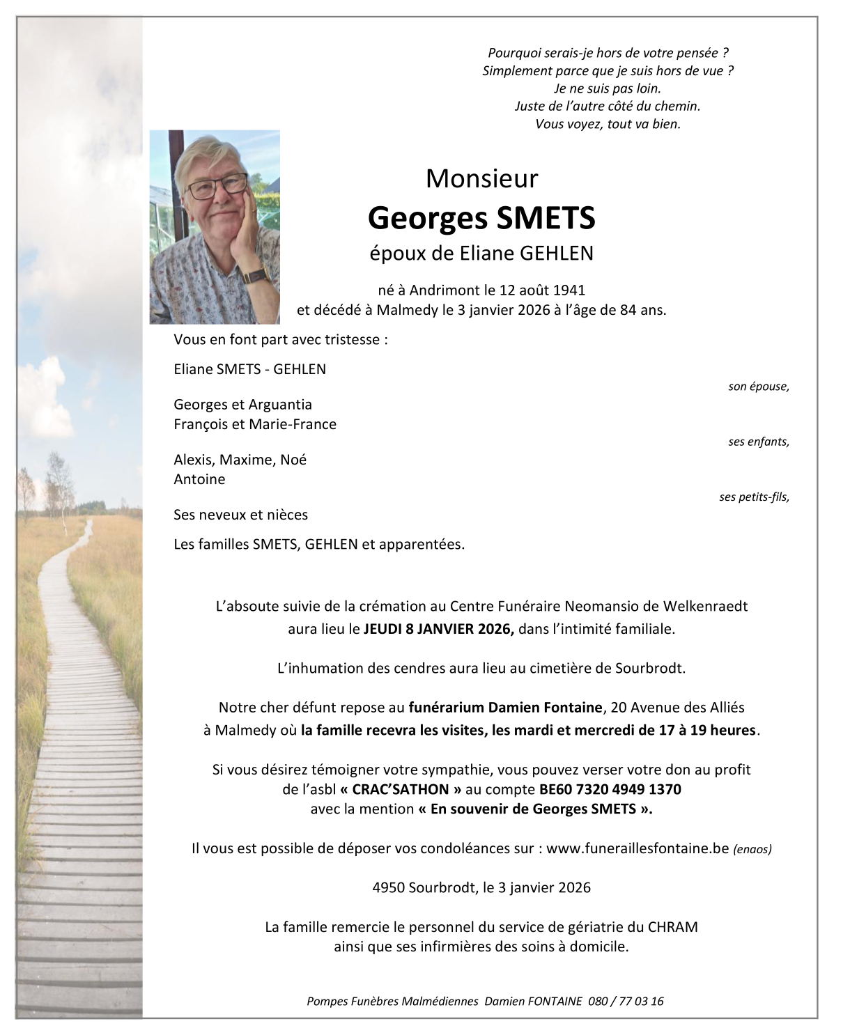 Décédé à Malmedy (4960, Belgique) le samedi 3 janvier 2026 à l'âge de 84 ans