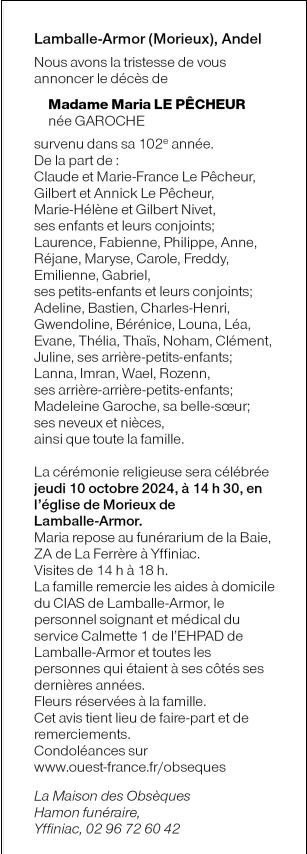 Décédée à Lamballe (22400) le samedi 5 octobre 2024 à l'âge de 101 ans