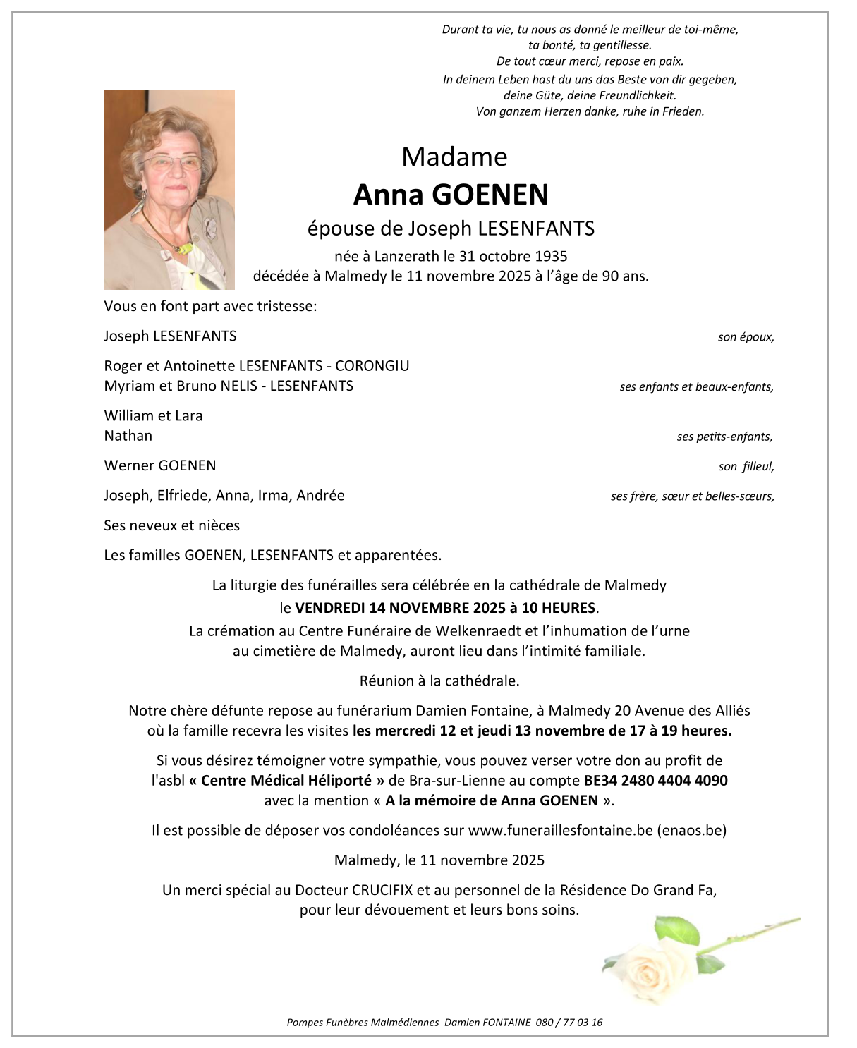 Décédée à Malmedy (4960, Belgique) le mardi 11 novembre 2025 à l'âge de 90 ans