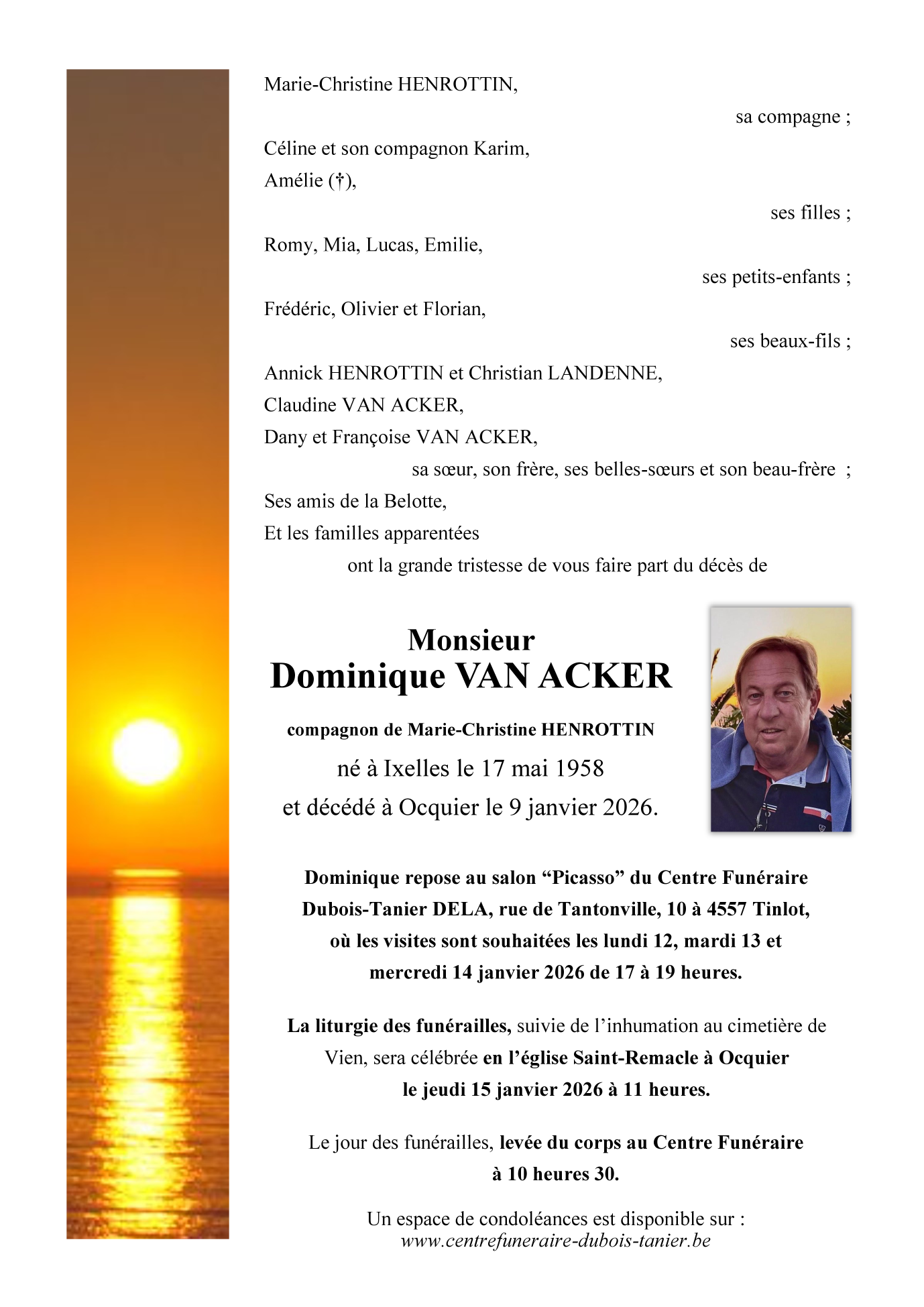 Fallecido en Ocquier (4560, Bélgica) el viernes, 9 de enero de 2026 a la edad de 67 años