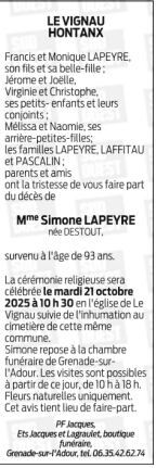 Décédée à Grenade-sur-l'Adour (40270) le mardi 14 octobre 2025 à l'âge de 93 ans