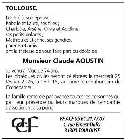 Décédé à Blagnac (31700) le jeudi 19 février 2026 à l'âge de 74 ans
