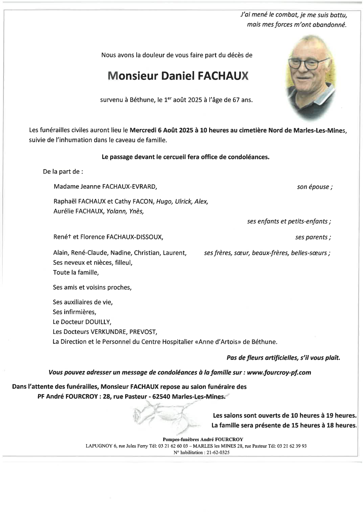 Décédé à Béthune (62400) le vendredi 1 août 2025 à l'âge de 67 ans