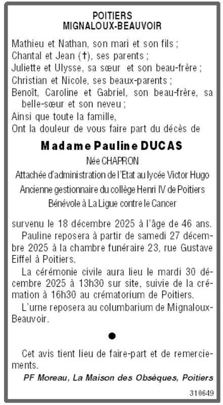 Décédée à Poitiers (86000) le jeudi 18 décembre 2025 à l'âge de 46 ans