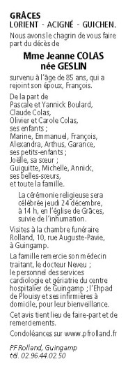 Décédée à Plouisy (22200) le lundi 21 décembre 2020 à l'âge de 85 ans