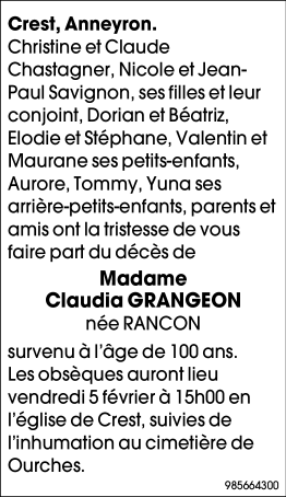 Overleden te Crest (26400) op woensdag 3 februari 2021 op 100-jarige leeftijd