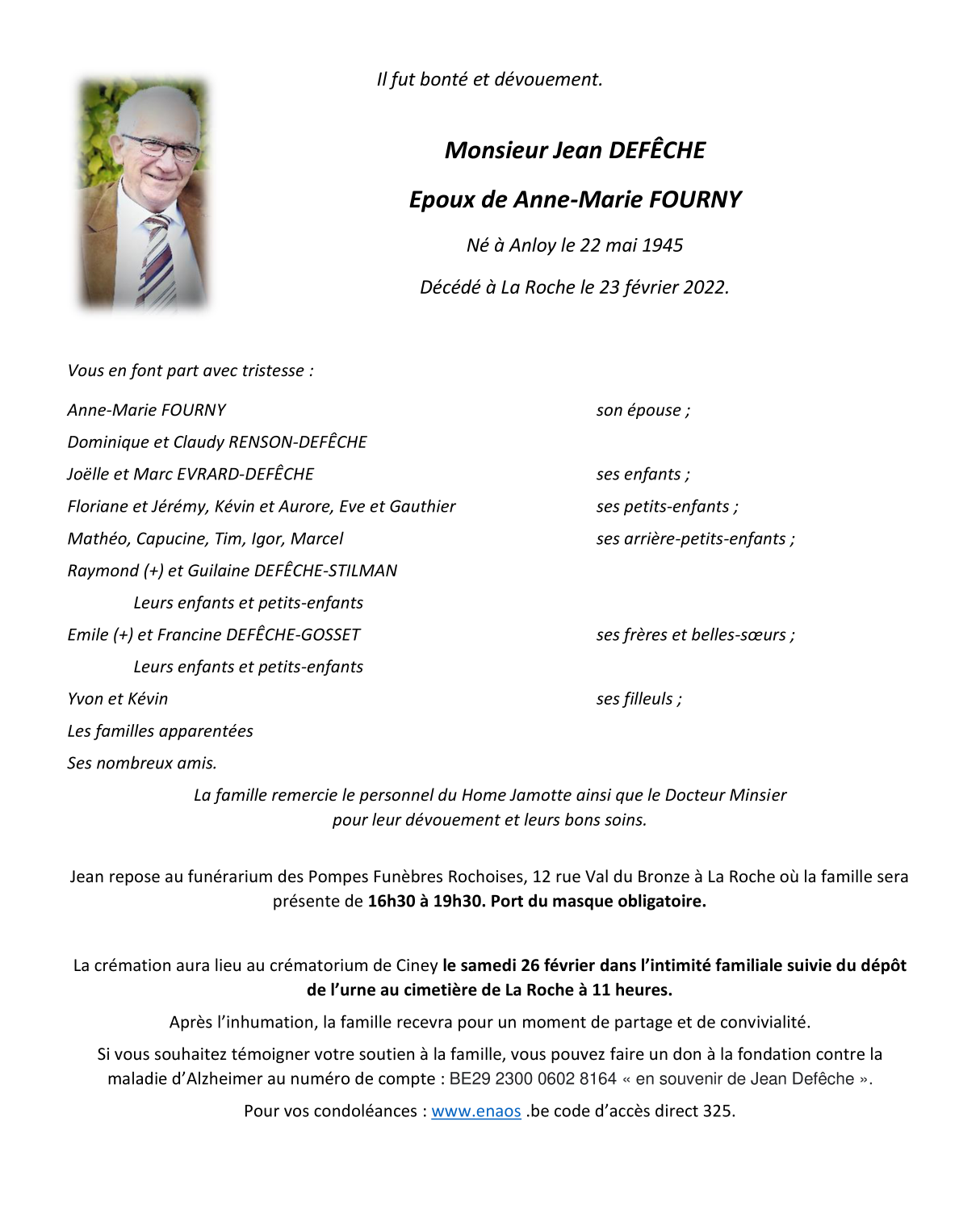 Overleden te La Roche-en-Ardenne (6980, België) op woensdag 23 februari 2022 op 76-jarige leeftijd