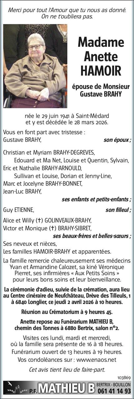 Décédée à Saint-Médard (6887, Belgique) le samedi 28 mars 2026 à l'âge de 84 ans