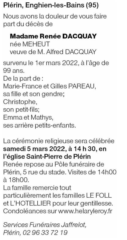 Overleden te Plérin (22190) op dinsdag 1 maart 2022 op 99-jarige leeftijd