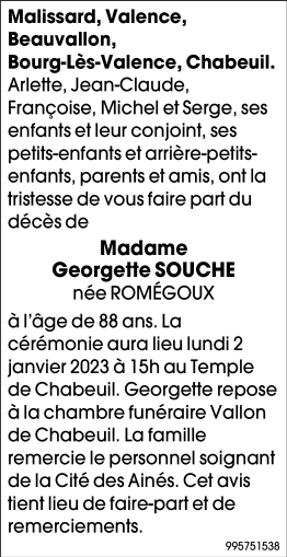 Décédée à Valence (26000) le mercredi 28 décembre 2022 à l'âge de 88 ans