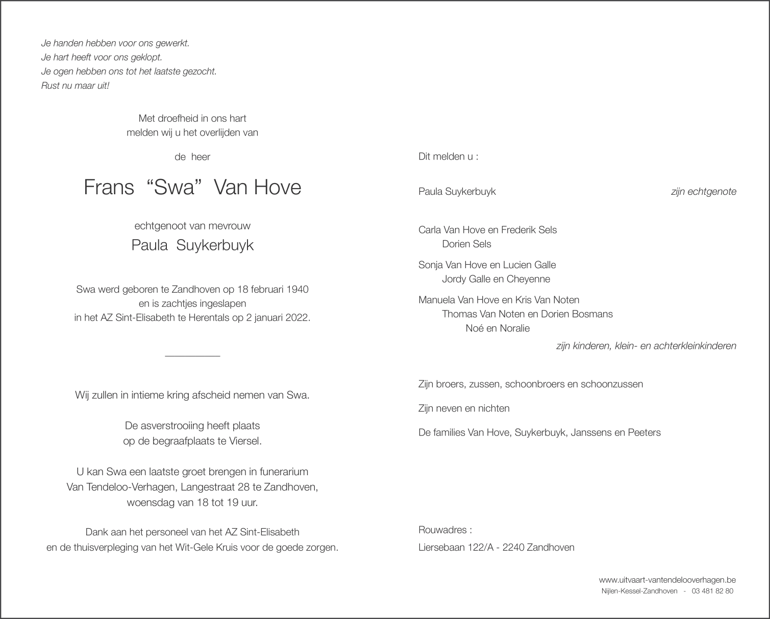 Fallecido en Herentals (2200, Bélgica) el domingo, 2 de enero de 2022 a la edad de 81 años