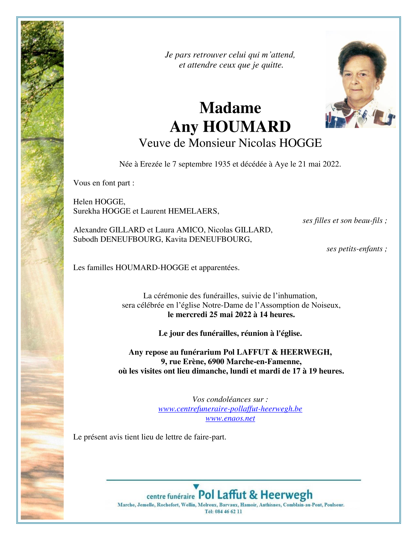 Décédée à Aye (6900, Belgique) le samedi 21 mai 2022 à l'âge de 86 ans