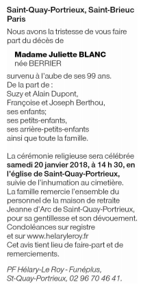 Décédée à Saint-Quay-Portrieux (22410) le mercredi 17 janvier 2018 à l'âge de 98 ans